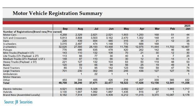 COLOMBO – Sri Lanka’s vehicle registrations continued to expand in September 2025, rising 27% to 48,708 from a month earlier, with a broad increase across categories, an analysis of vehicle registry data by J B Securities, a Colombo-based brokerage, shows.