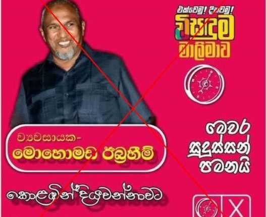 It included an image appearing to show a campaign poster for wealthy spice trader Mohamed Ibrahim, the father of two suicide bombers in the 2019 Easter attacks considered the worst-ever against civilians in the island nation (archived link).