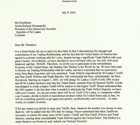 COLOMBO – US President Donald Trump’s latest global tariff warning campaign took an awkward and telling turn this week, exposing not just the administration’s aggressive economic posture, but its startling lack of diplomatic finesse. At the centre of one such episode was Sri Lanka, which received a formal presidential letter from Trump threatening a 30% tariff on exports. The problem? The letter misspelled the President’s name.