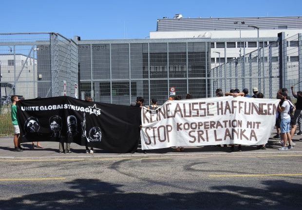 Dozens of protestors gathered outside of a deportation prison Bässlergut last month shouting slogans and carrying placards that denounced Switzerland’s deportation of Tamils. Campaigners accused the Swiss government of working with the Sri Lankan state and being complicit in Colombo’s repression of Tamils.