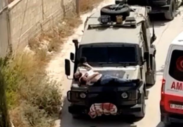 JERUSALEM – Israeli army forces strapped a wounded Palestinian man to the hood of a military jeep during an arrest raid in the occupied West Bank city of Jenin on Saturday (22).