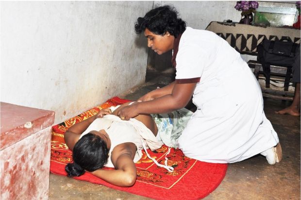 Prenatal care in Sri Lanka. A health worker checking a pregnant woman during a home visit – WHO / Nimal Garnage