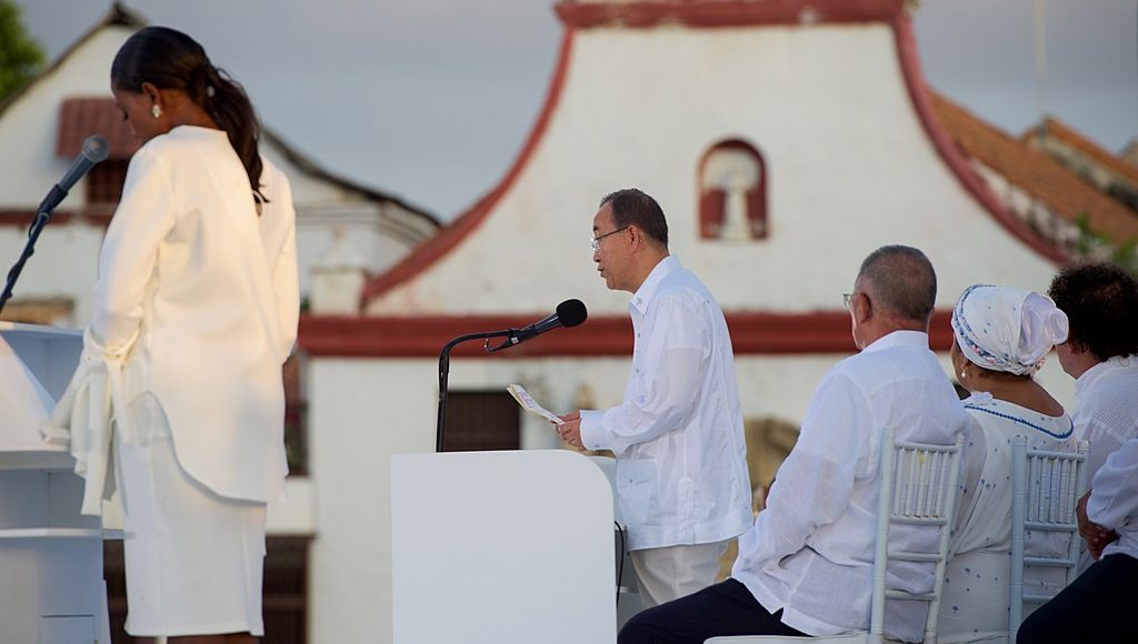 Photo Caption – Secretary-General Ban Ki-Moon addresses the crowd at the Colombian peace ceremony in Cartagena where Colombian President Juan Manuel Santos and FARC leader Timoleón Jiménez signed a peace accord on September 26, 2016 –US State Department