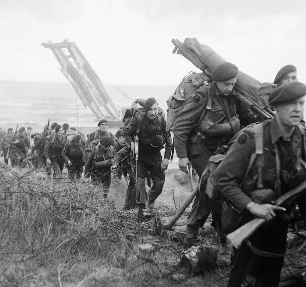 Photo Caption – Royal Marine Commandos attached to 3rd Division move inland from Sword Beach on the Normandy coast, June 6, 1944.  A Churchill bridgelayer can be seen in the background – Wikipedia